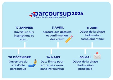 17 janvier 2024 : La phase de dépôt des vœux d’inscription, ouverte jusqu’au 11 mars. Ouverture de la plateforme parcoursup pour s'inscrire et formuler ses vœux 14 mars 2024 :